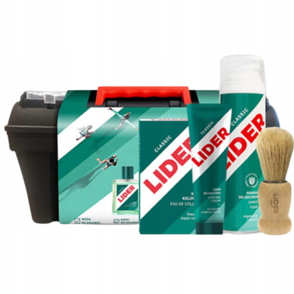 Lider vyrų skutimosi kosmetikos rinkinys – losjonas, kremas, putos ir šepetėlis dėžutėje