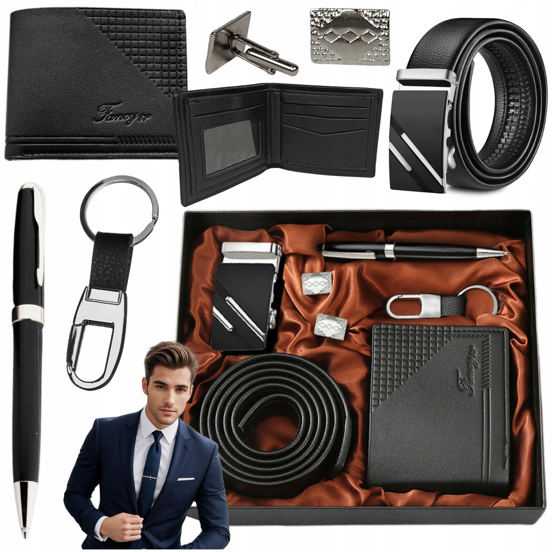 Dovanų rinkinys vyrui – piniginė, diržas, sąsagos, rašiklis ir raktų pakabukas