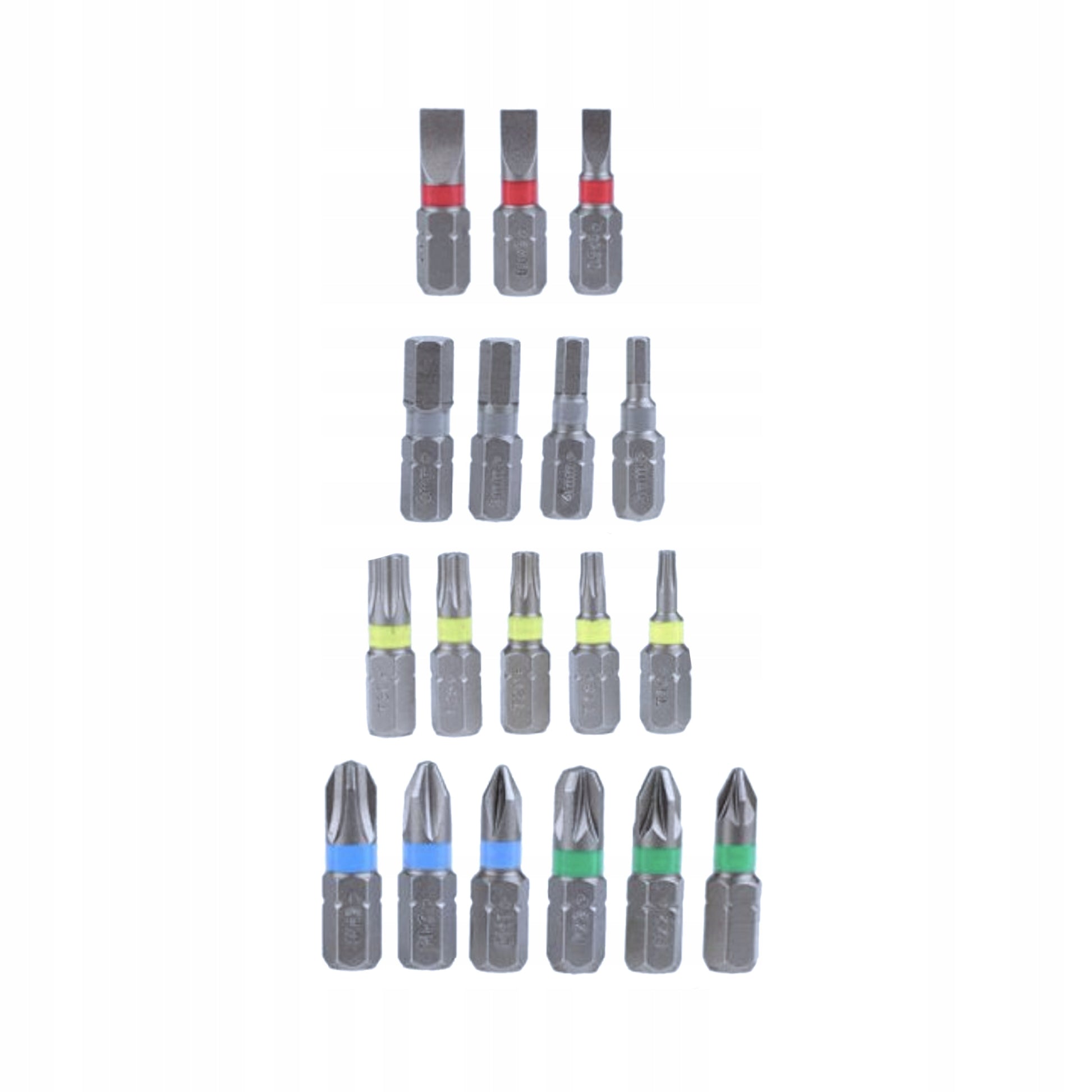 18 vnt. spalvotų antgalių rinkinys: PH1/2/3, PZ1/2/3, SL4/5/6, T10/15/20/25/30, HEX 3/4/5/6.