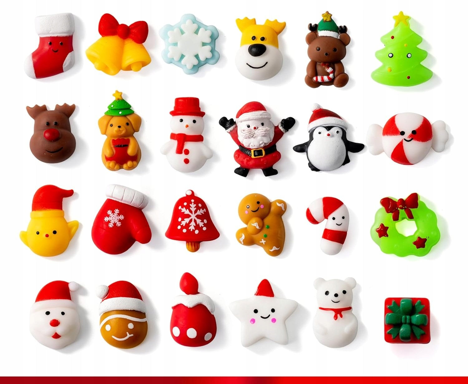 24 kalėdinės mochi figūrėlės: elniai, sniego seniukai, Kalėdų seneliai, žvaigždės, gyvūnėliai ir kiti šventiniai motyvai.