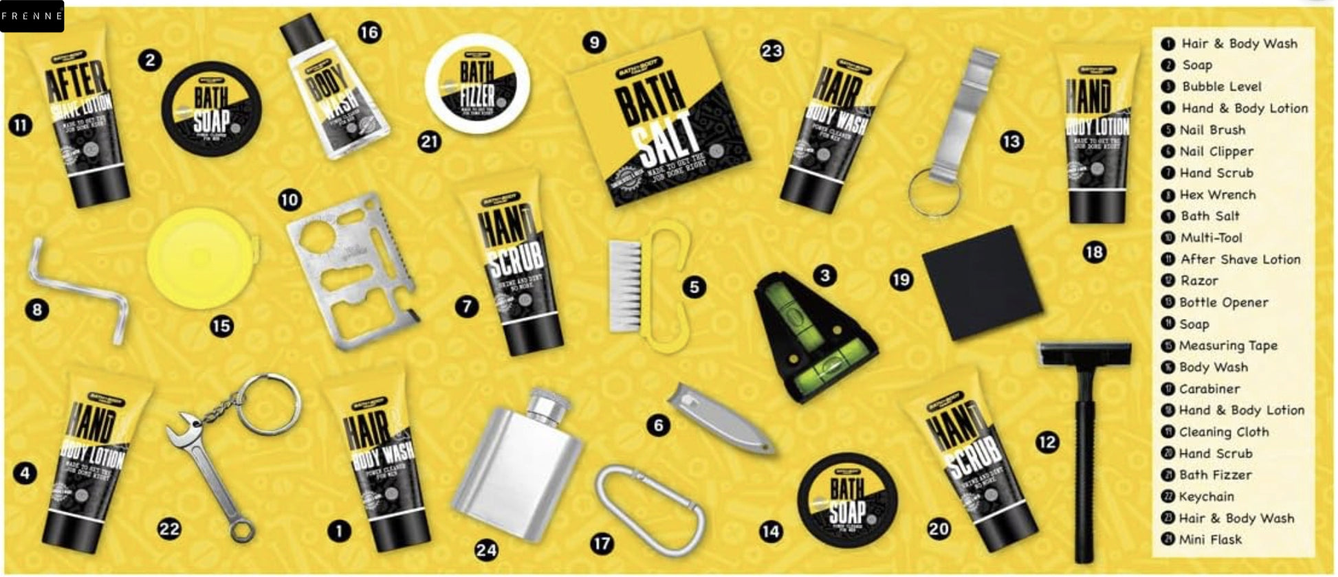 Kalendoriuje rasite 24 skirtingas kosmetikos priemones, tinkamas veido, kūno, plaukų ir barzdos priežiūrai. Tai gali būti: