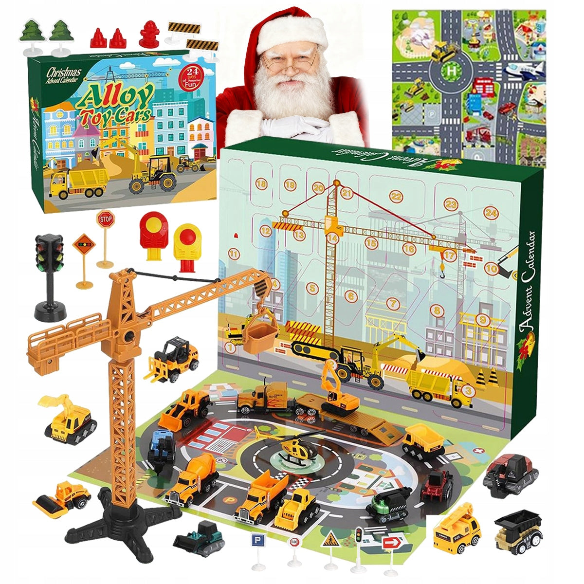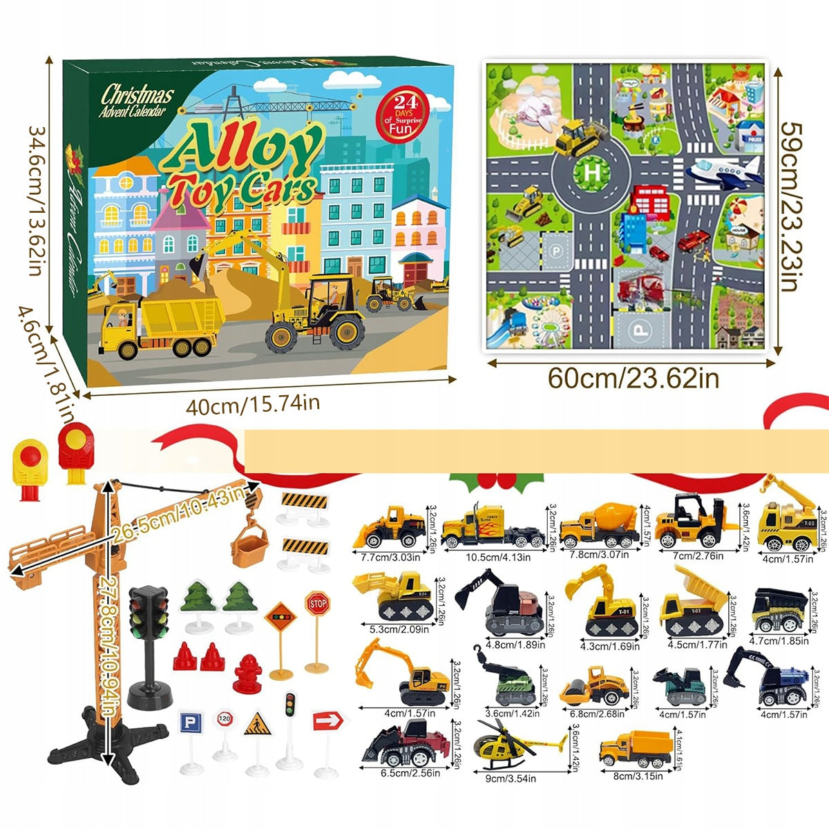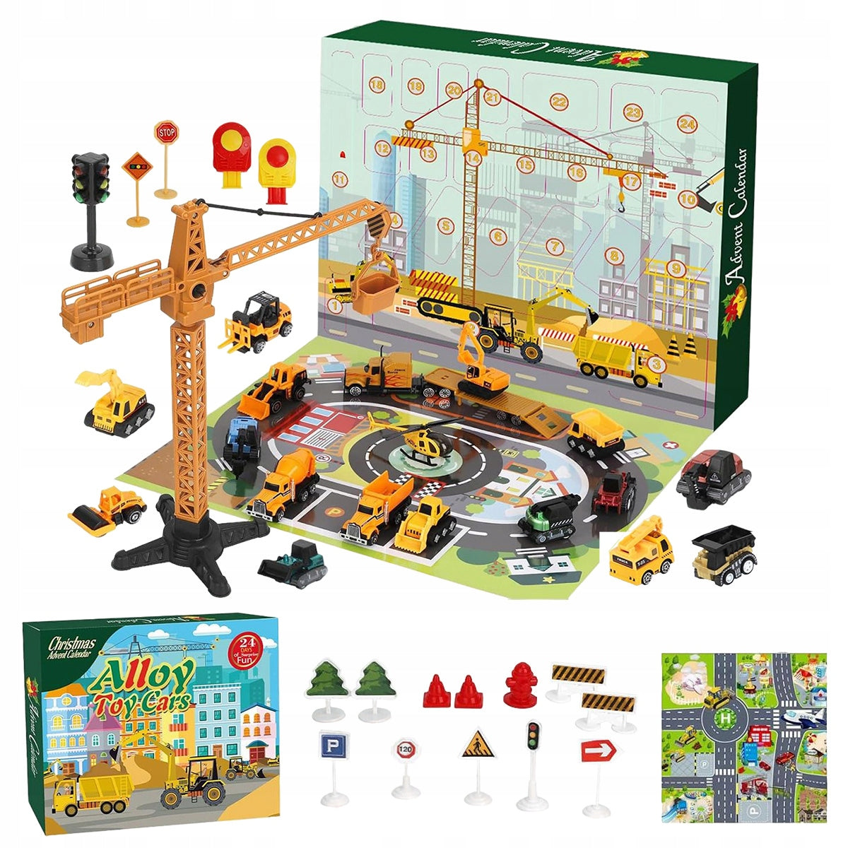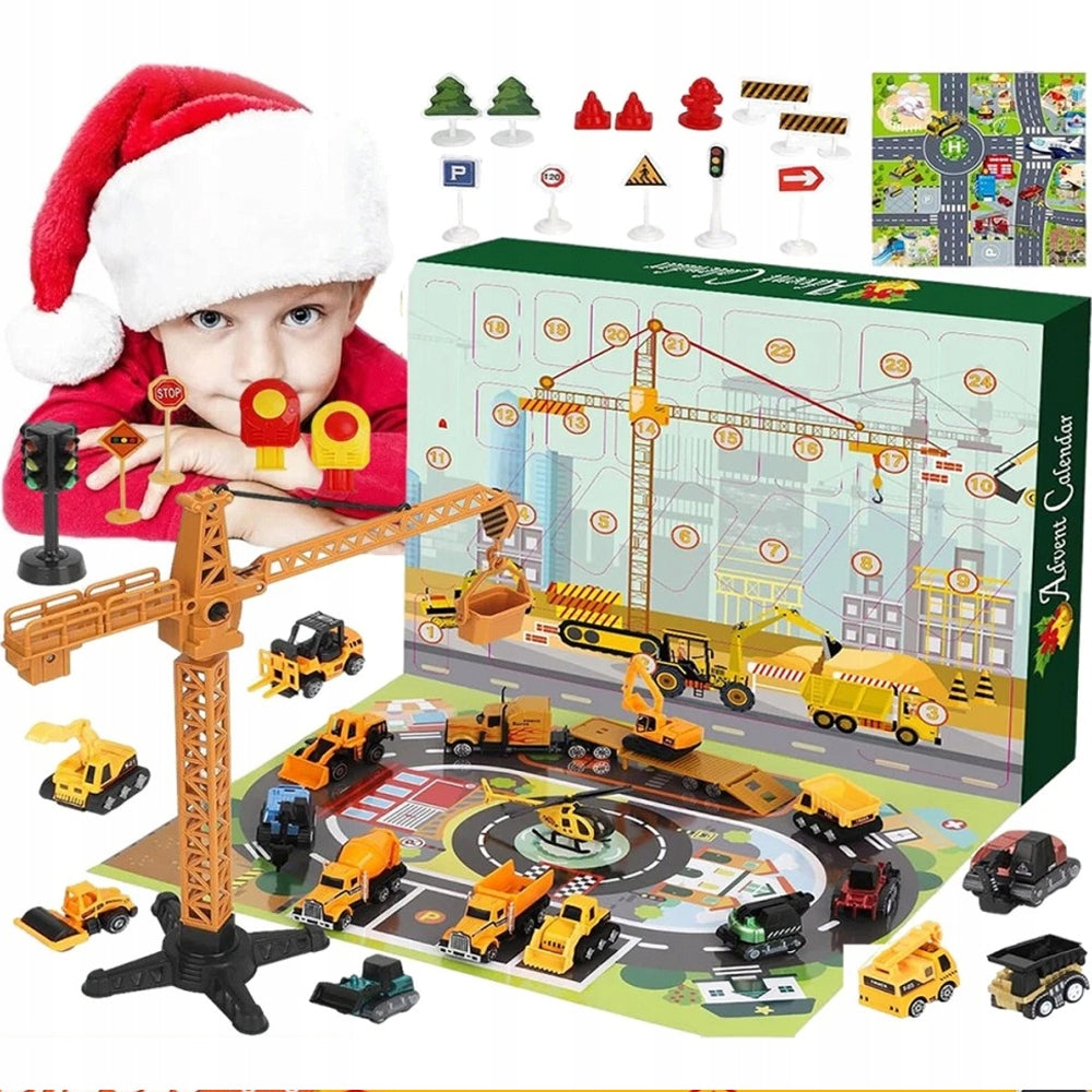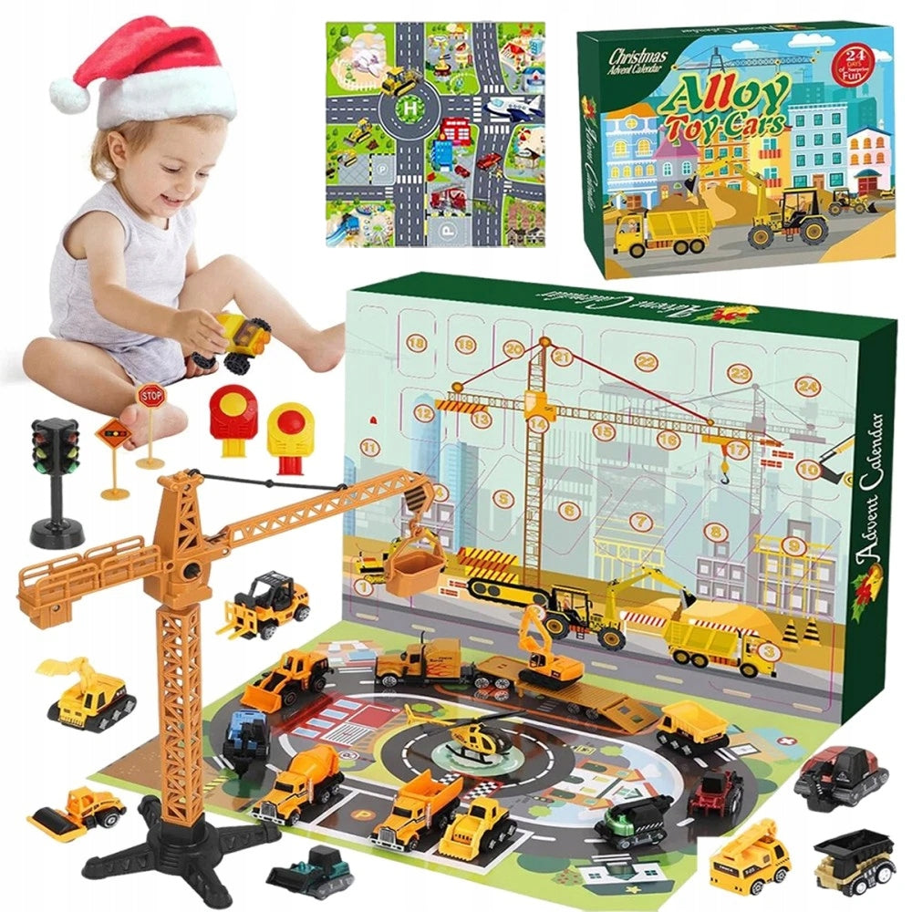 Advento kalendorius vaikams 2025 – 24 dienų kalėdinis rinkinys su metaliniais automobiliais ir statybinėmis mašinėlėmis