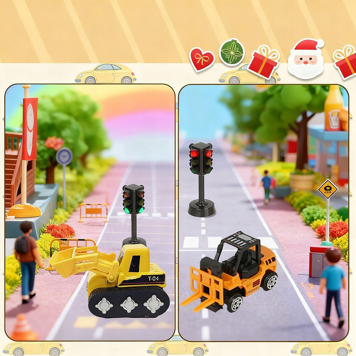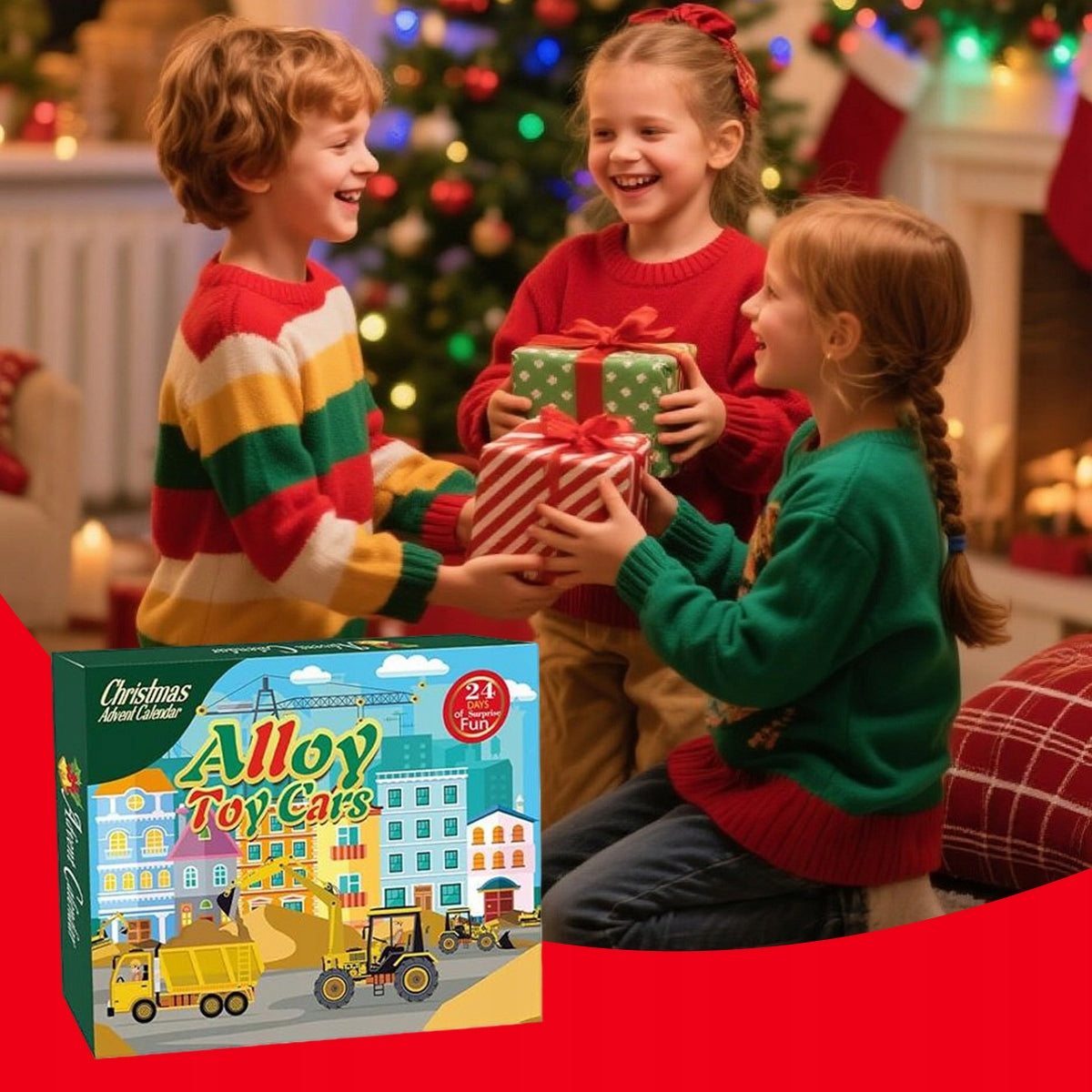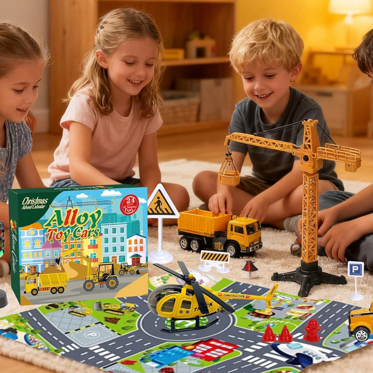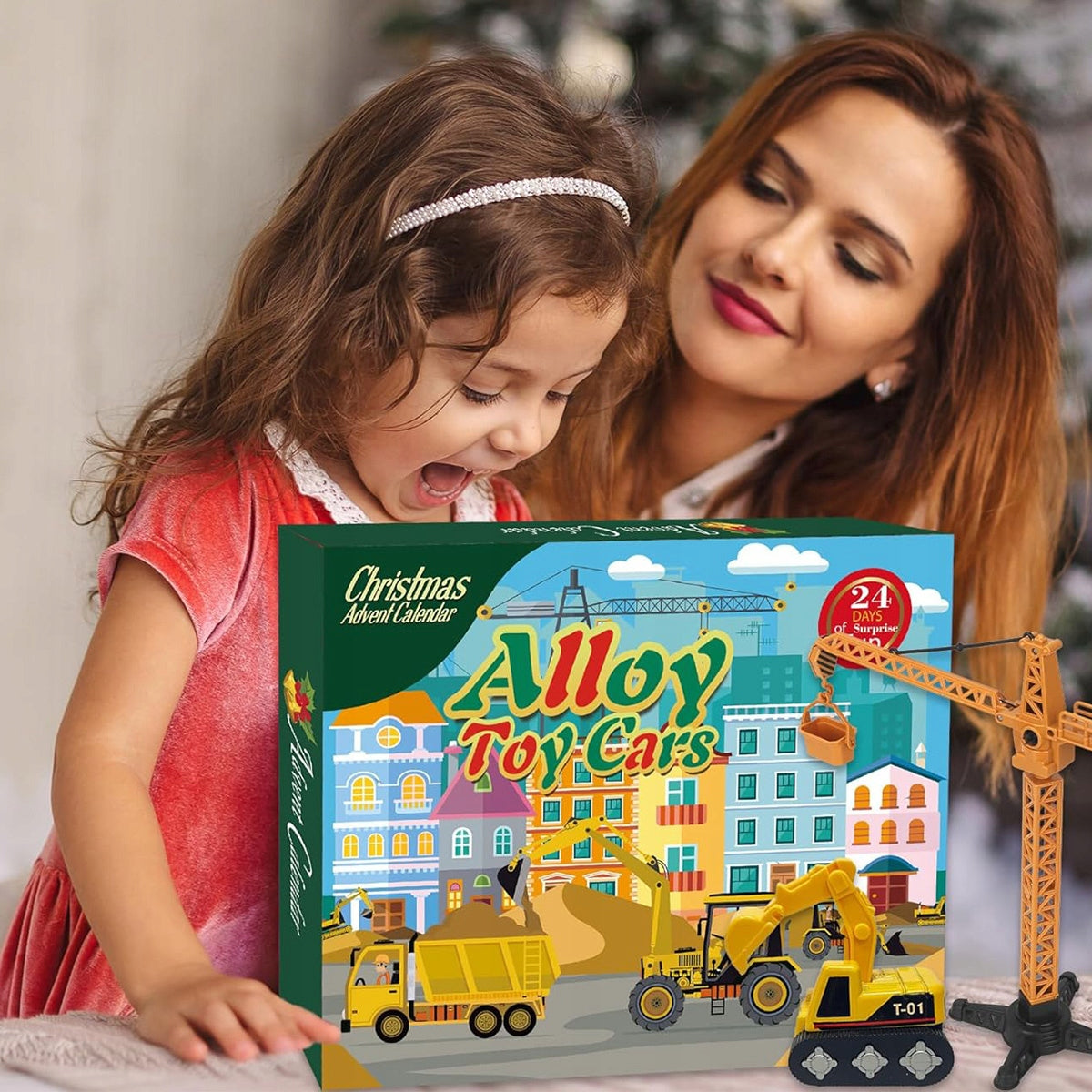 Advento kalendorius vaikams 2025 – 24 dienų kalėdinis rinkinys su metaliniais automobiliais ir statybinėmis mašinėlėmis