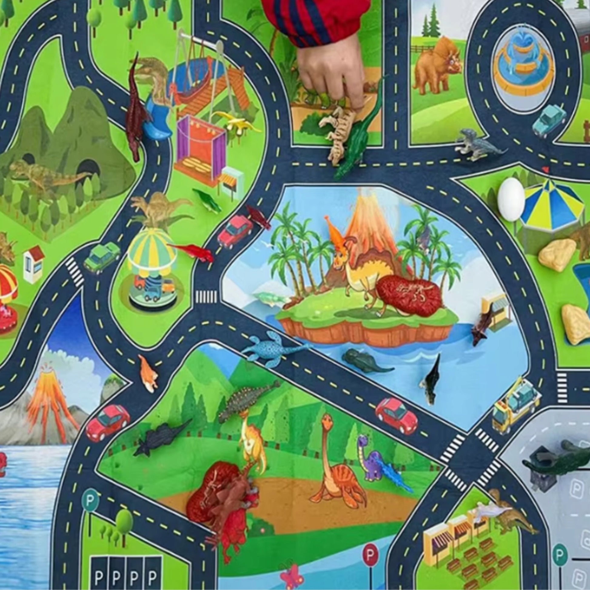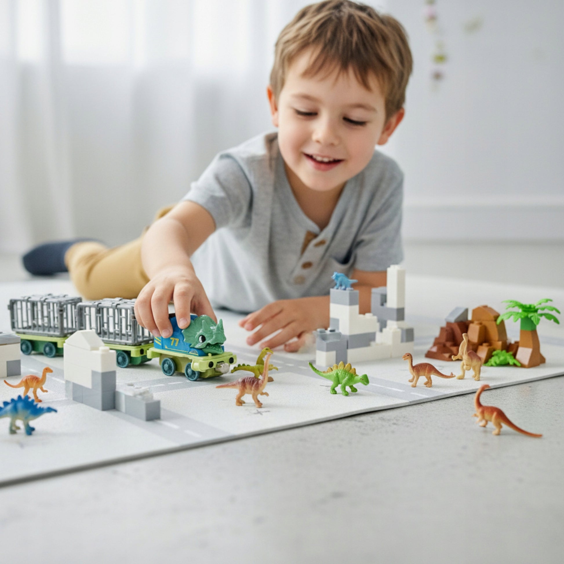Kūrybiškas žaidimas – vaikas gali pats kurti savo priešistorinį pasaulį su dinozaurais, traukiniais ir žemėlapiu.
