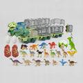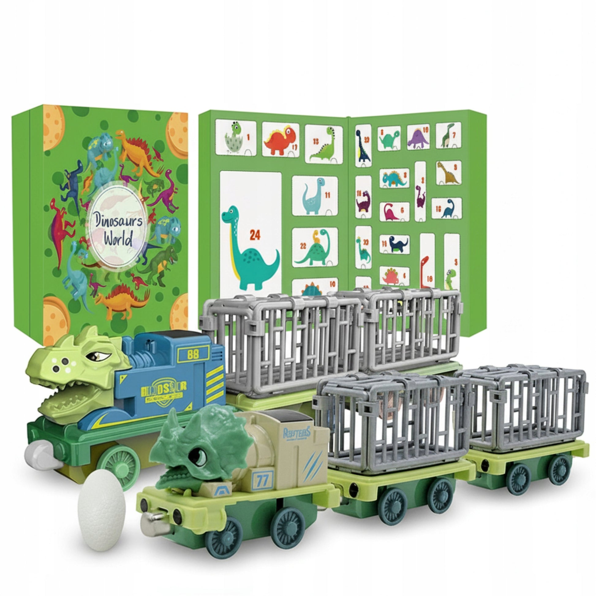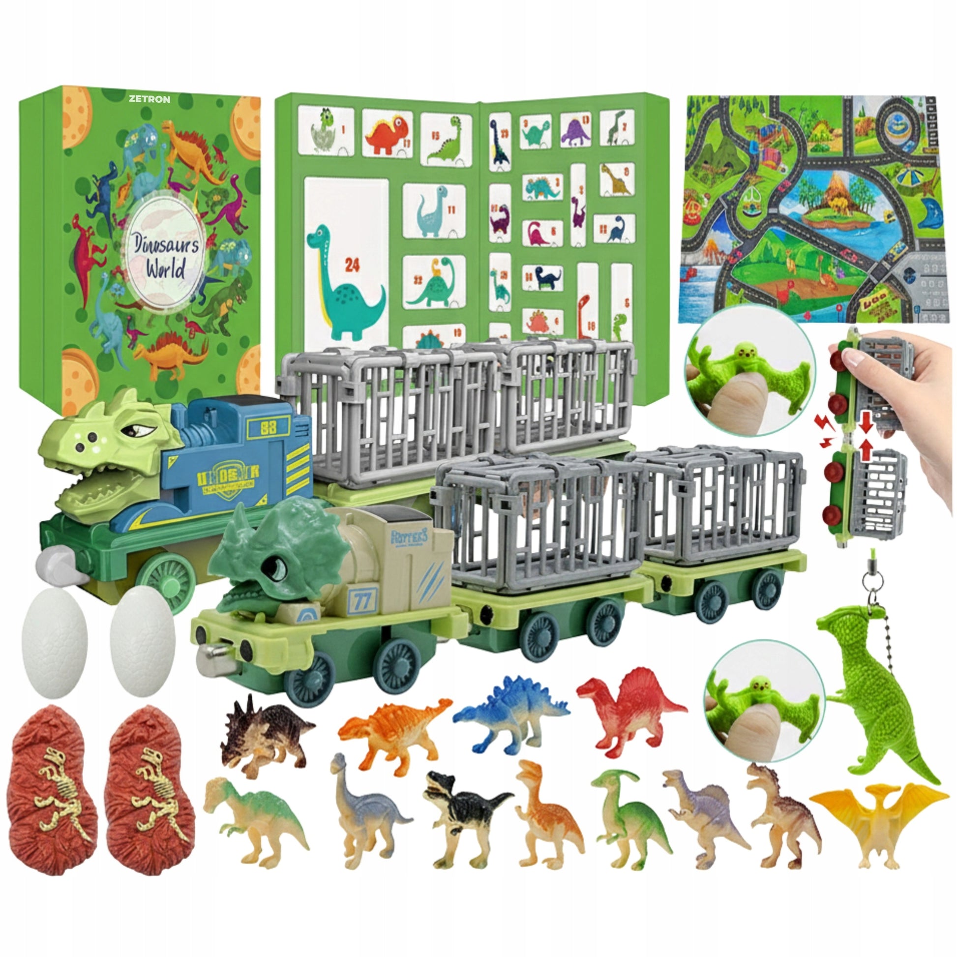 Pilnas rinkinys vienoje dėžėje – kalendorius, dvi dinozaurų formos lokomotyvės, du vagonai, žaidimų kilimėlis, figūrėlės ir papildomi priedai.