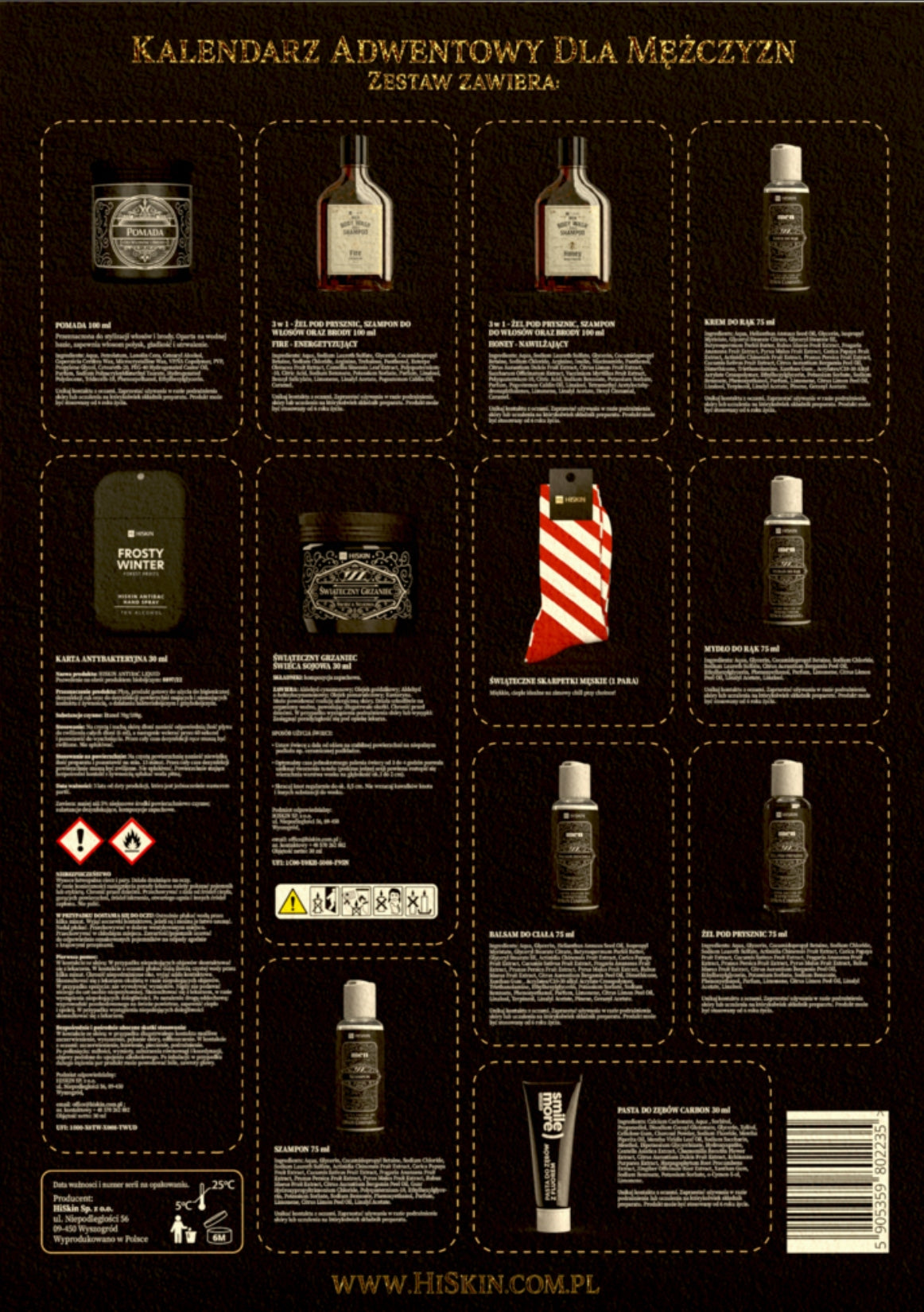 Advento kalendorius vyrams HiSkin su kosmetika ir kojinėmis – 12 elementų
