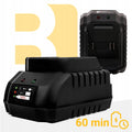 2× 20V 4.0Ah Li-Ion akumuliatoriai + greitas įkroviklis – darbas be pertraukų.