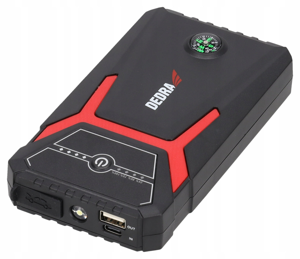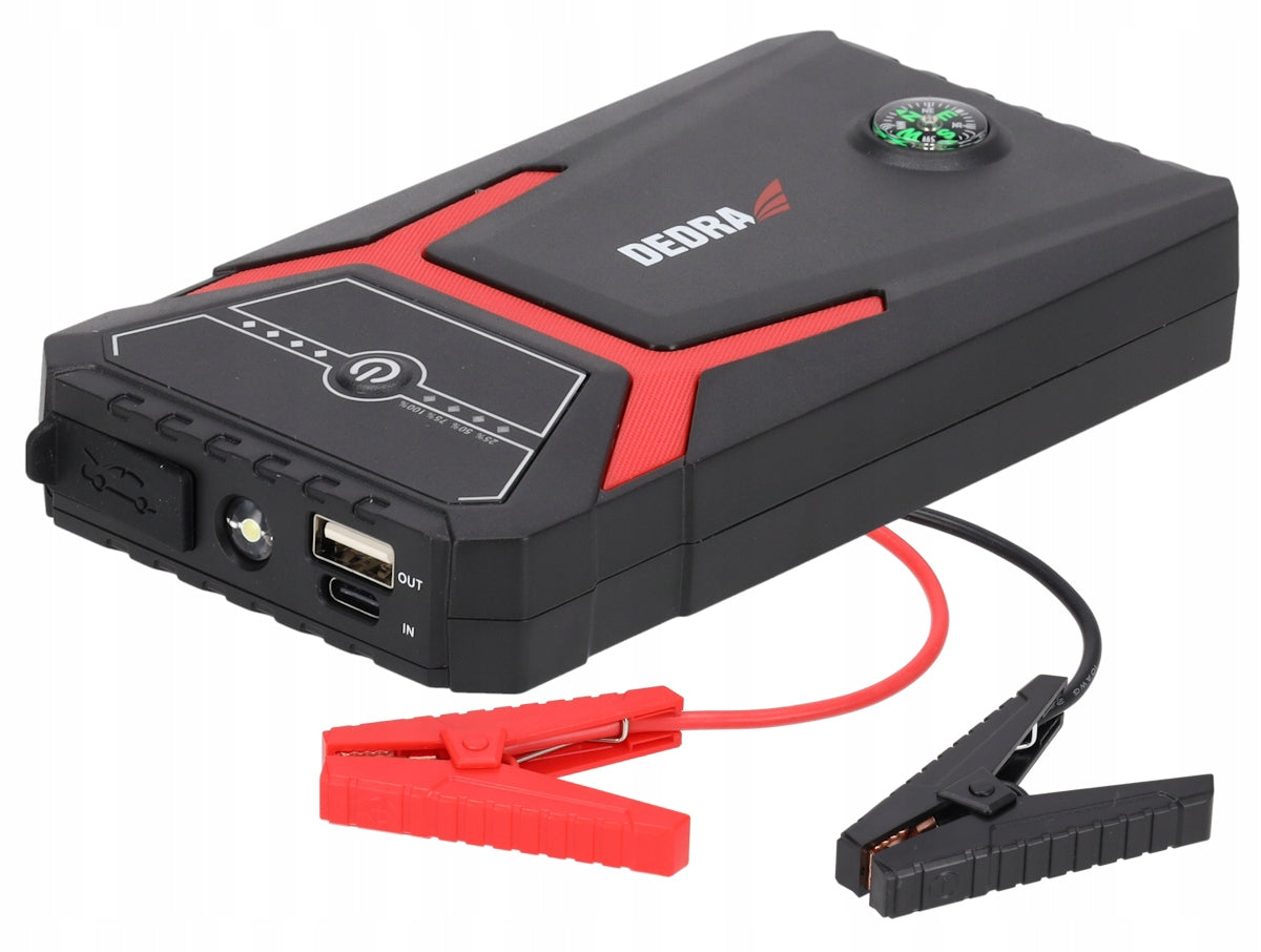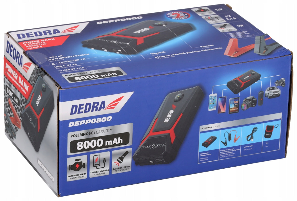 Kompaktiškas ir patikimas DEDRA DEPP0800 automobilio užvedimo įrenginys (jump starter / powerbank) – tai universalus pagalbininkas, kuris leis užvesti automobilį, motociklą ar net valtį, kai išsikrauna akumuliatorius. Be to, įrenginys gali būti naudojamas kaip powerbankas – jis greitai įkraus telefoną, planšetę ar kitus USB įrenginius.