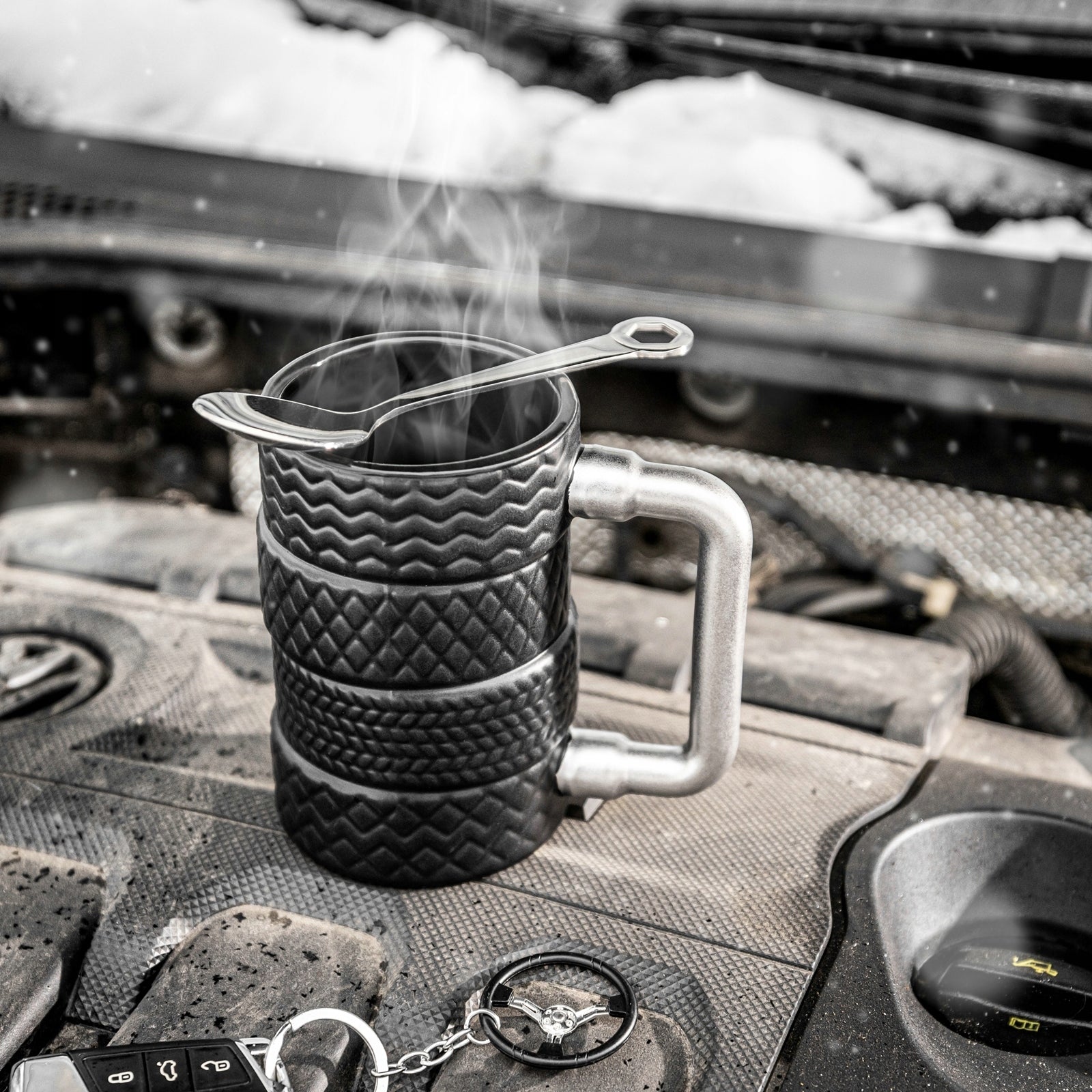 Originali ir įsimintina dovana vairuotojui, mechanikui ar automobilių entuziastui. Rinkinys sukurtas taip, kad kiekviena detalė primintų apie aistrą keturiems ratams – nuo padangų motyvu dekoruoto puodelio iki įrankio formos šaukštelio ir vairo formos breloko.