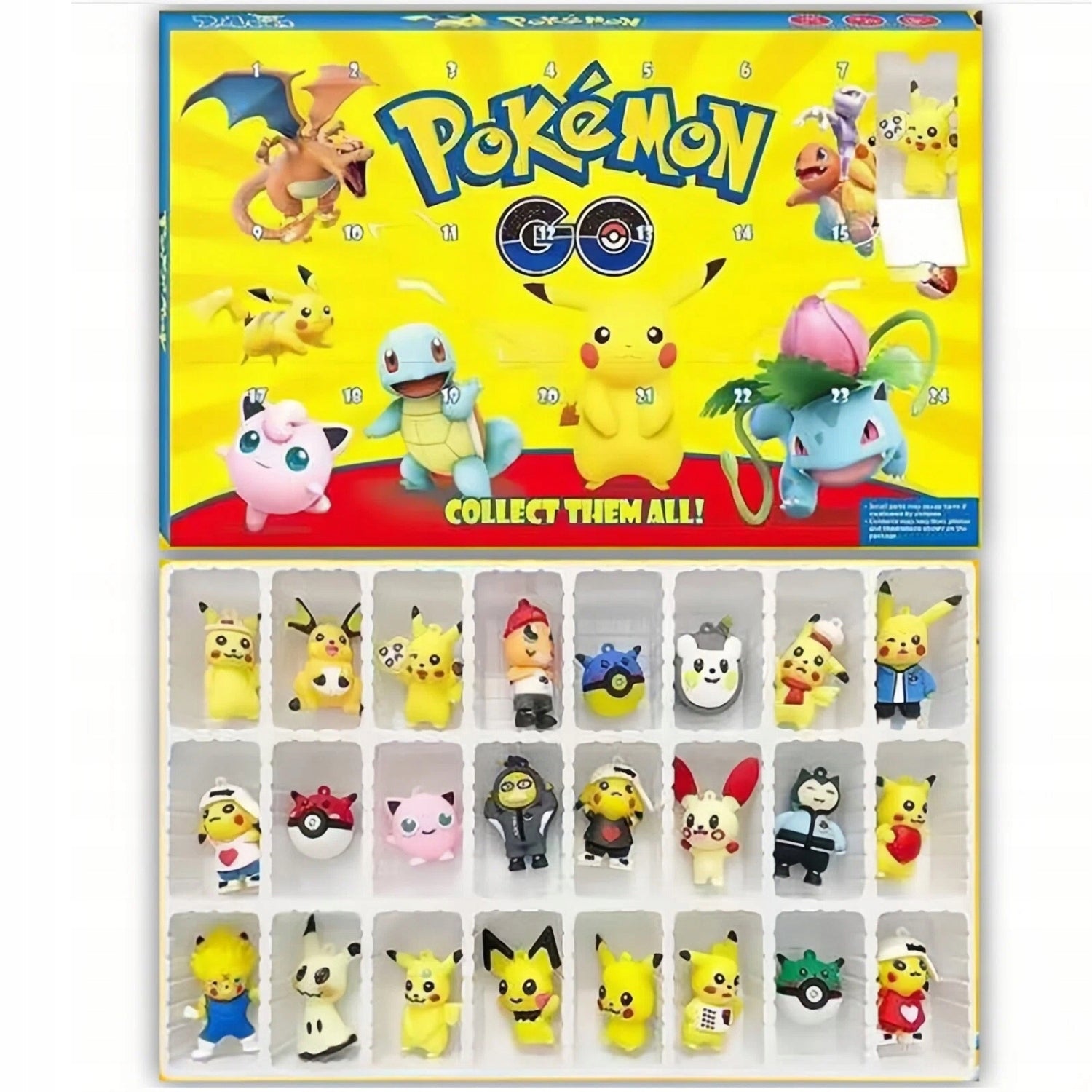 24 Pokémon figūrėlės – įvairūs veikėjai iš garsaus Pokémon pasaulio, tarp jų ir Pikachu su draugais.