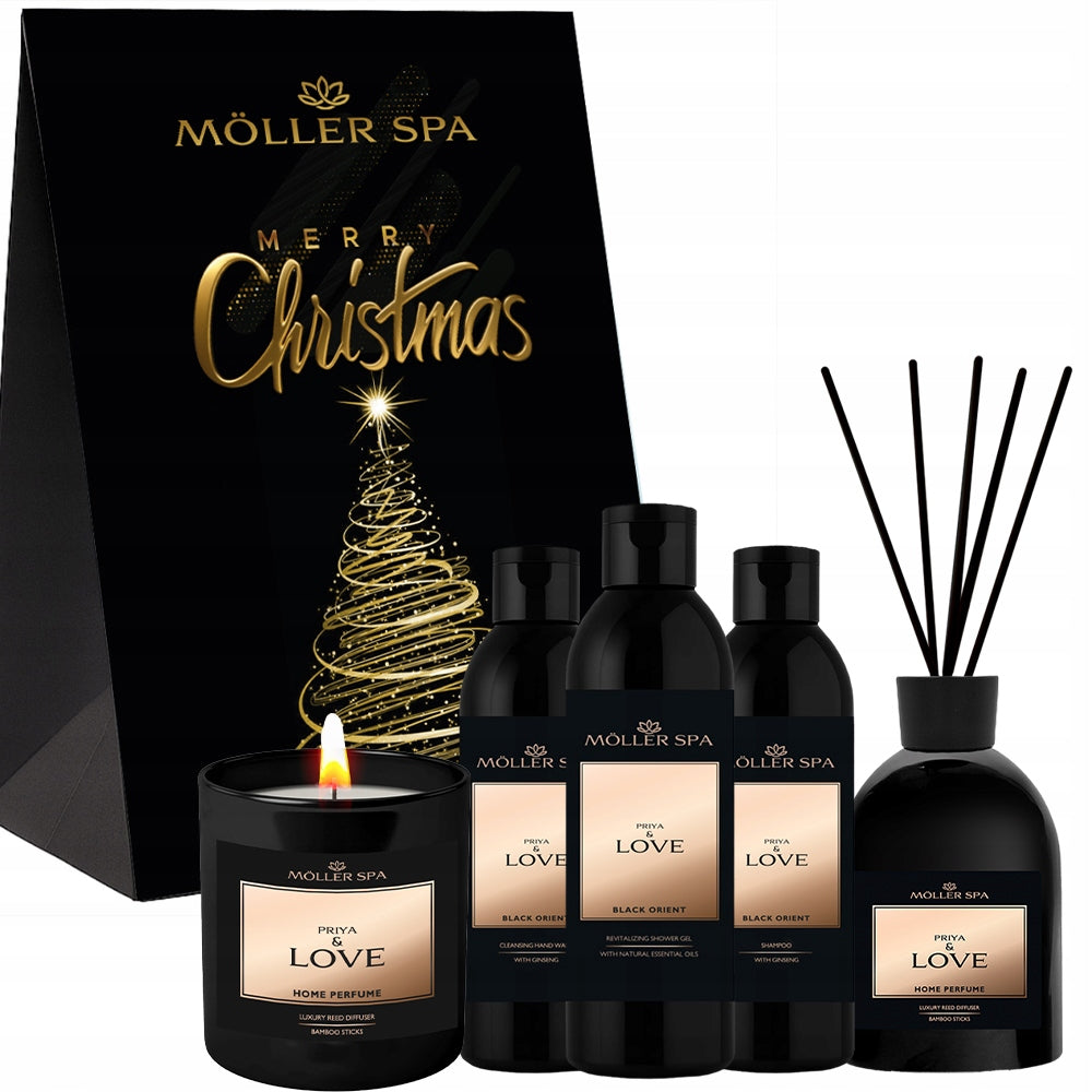Priya & Love dovanų rinkinys – kalėdinis rinkinys su žvake, difuzoriumi ir kūno kosmetika