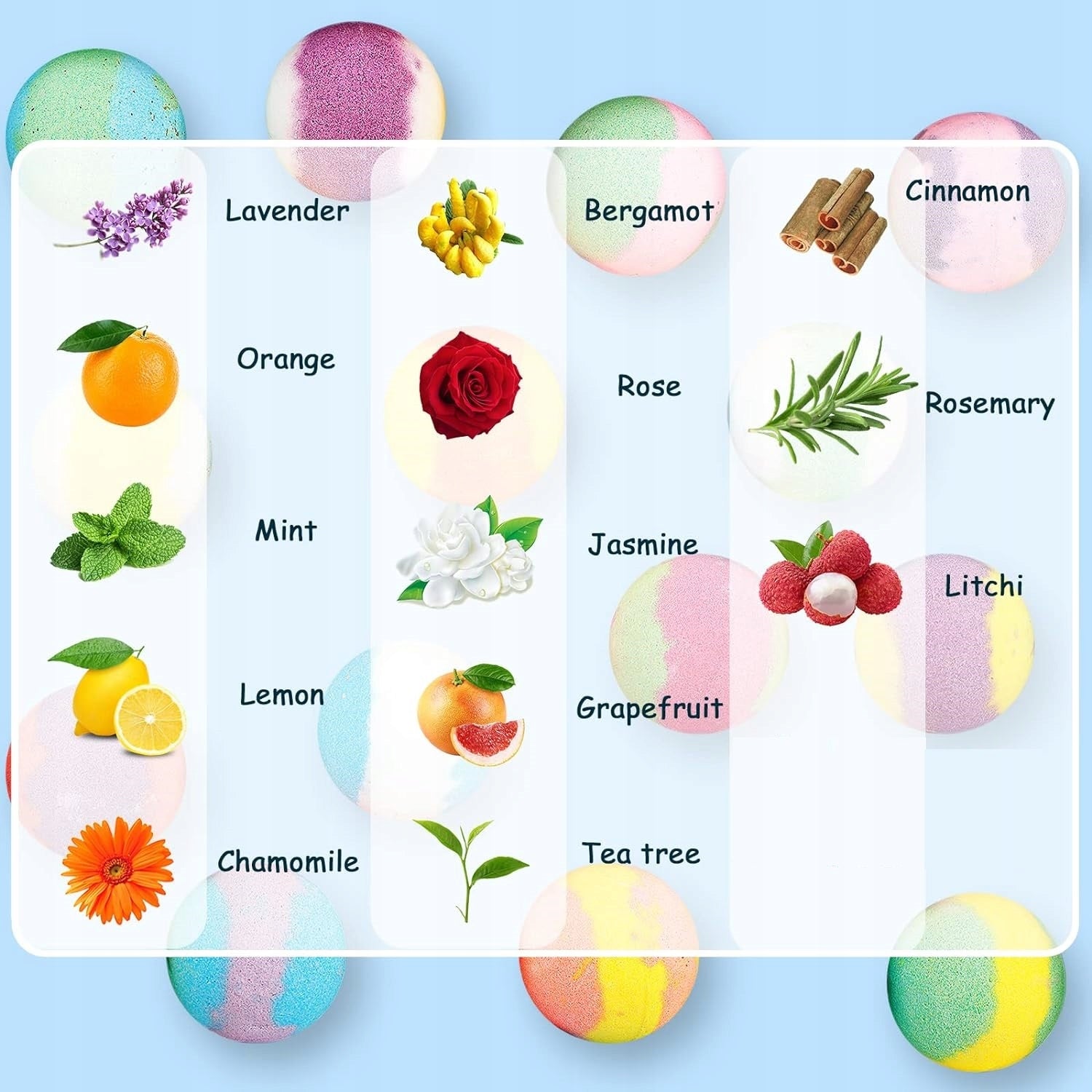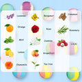 • 14 skirtingų aromatų – levanda, apelsinas, mėta, citrina, ramunėlė, greipfrutas, arbatmedis, bergamotė, rožė, rozmarinas, cinamonas, jazminas, vanilė ir ličiai.