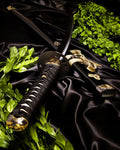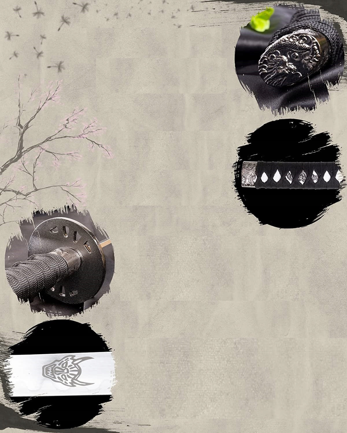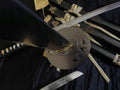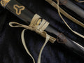 - Rankena: Juodas medvilninis virvės pynimas, imitacija odos ant korys, metalinė tsuba