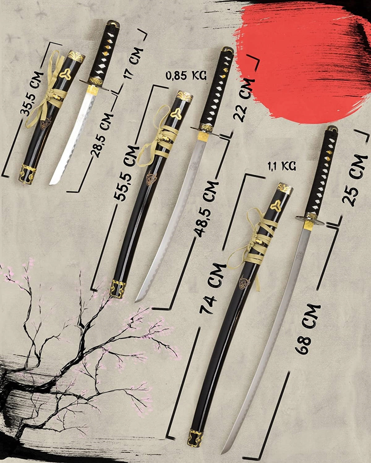 - Katana (pilnas ilgis su vagina: 104 cm, be vaginos: 97 cm, peilio ilgis: 68 cm)