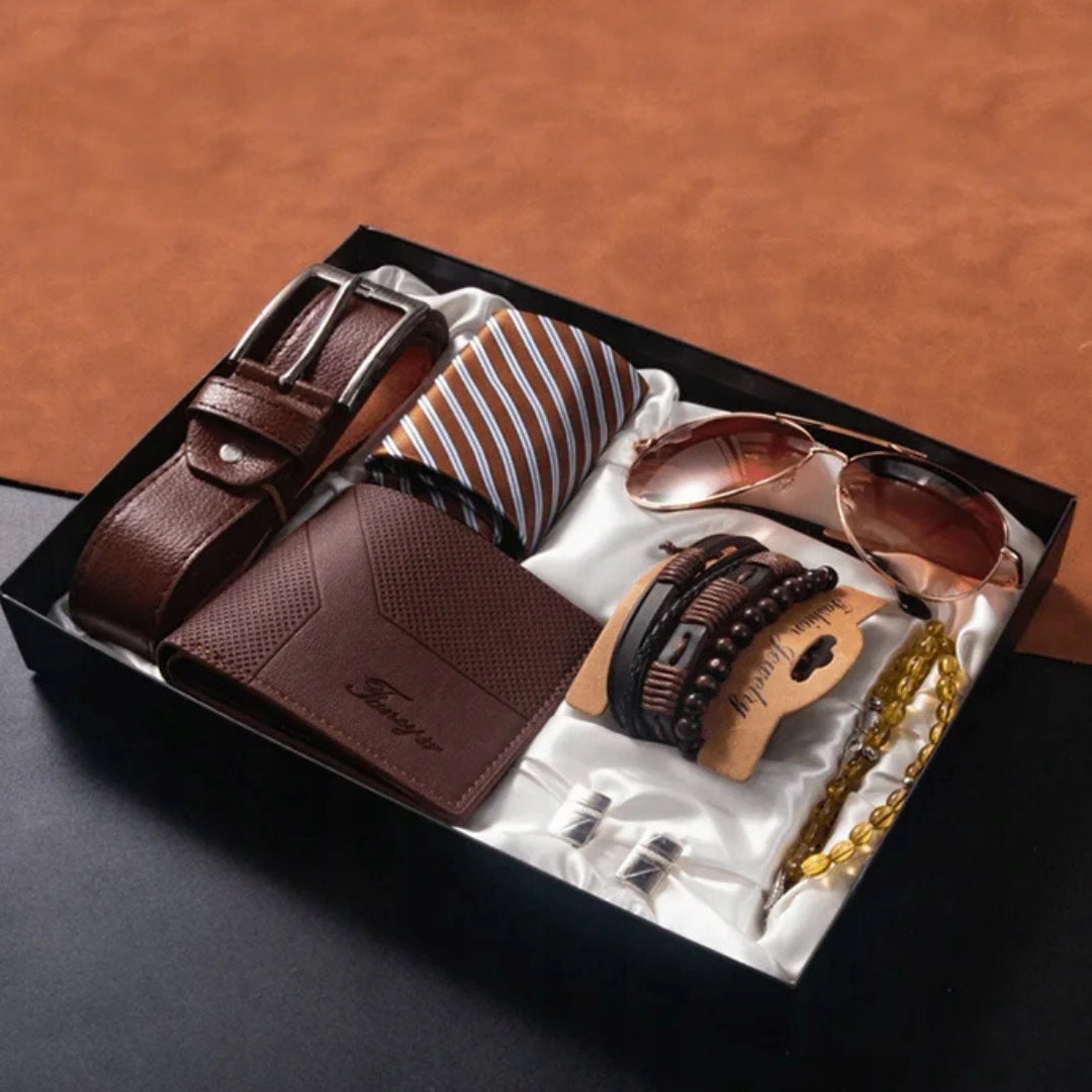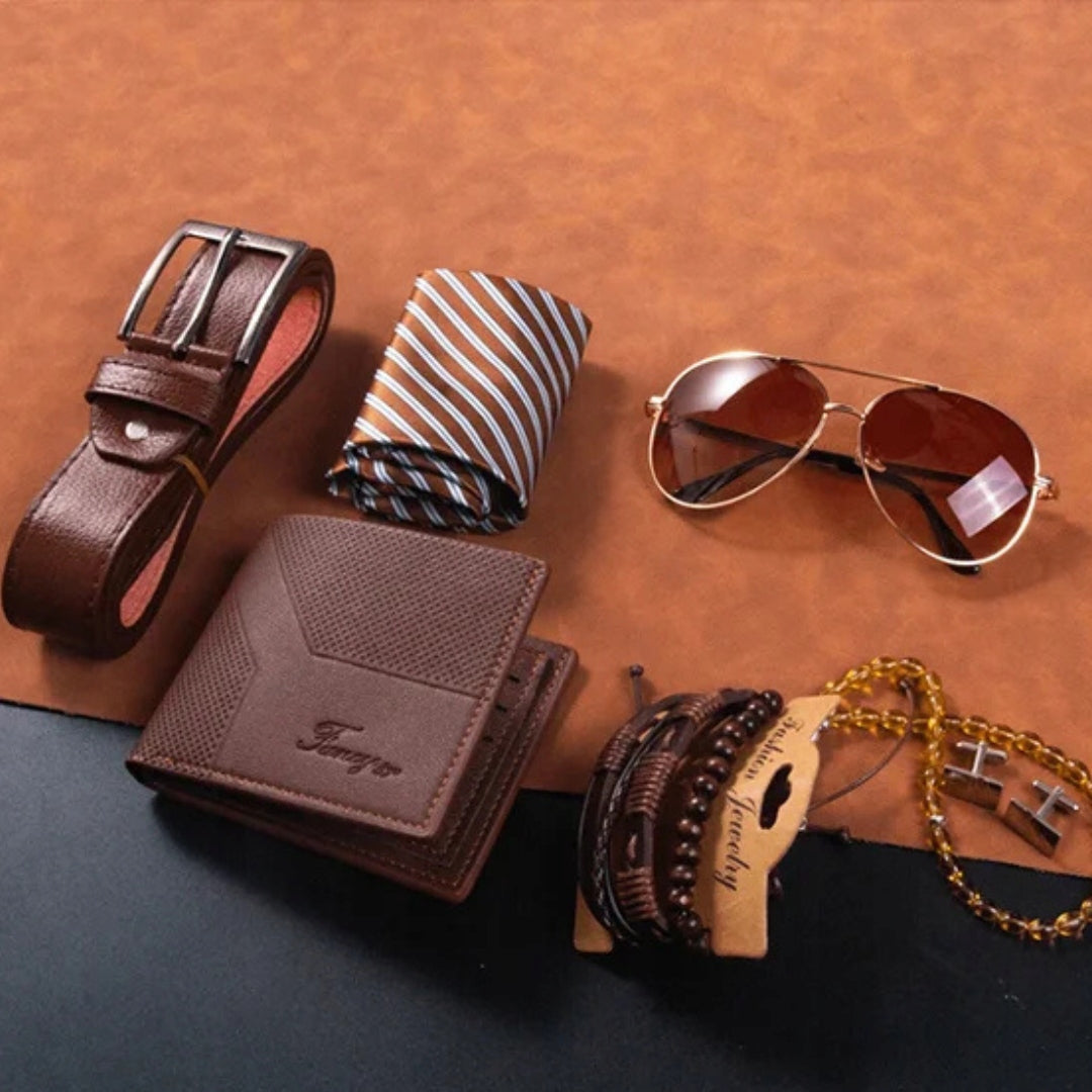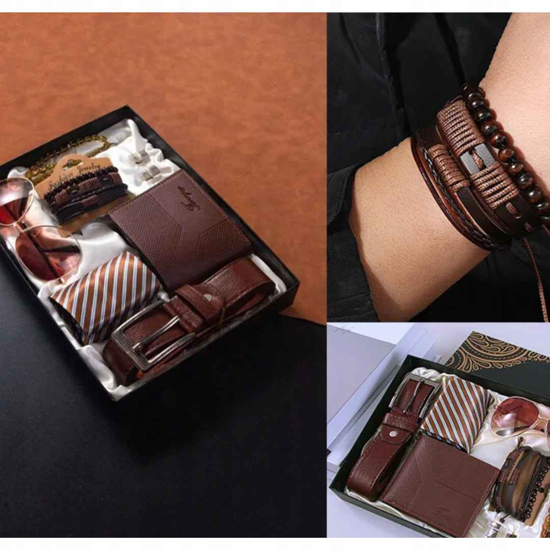 Vyriškas dovanų rinkinys – piniginė, diržas, akiniai, apyrankės, kaklaraištis, sąsagos